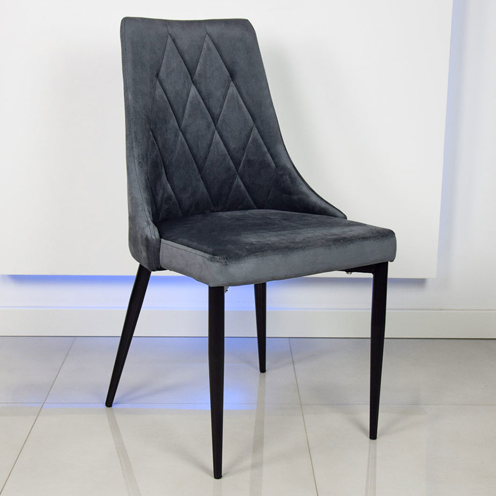 Kontrast między szarym welurem a czarnym metalem tworzy harmonijną kombinację, która pasuje do różnorodnych aranżacji wnętrz.