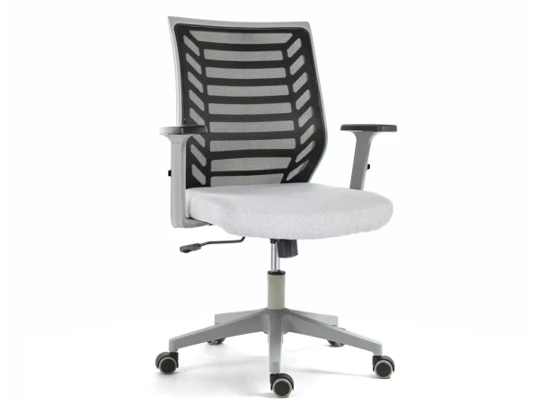 Fotel obrotowy, tapicerka: tkanina + siatka, stelaż: tworzywo, kolor: szary + czarny / szary. Mechanizm TILT, regulowane podłokietniki (Uwaga: poduszki podłokietników w kolorze czarnym).
