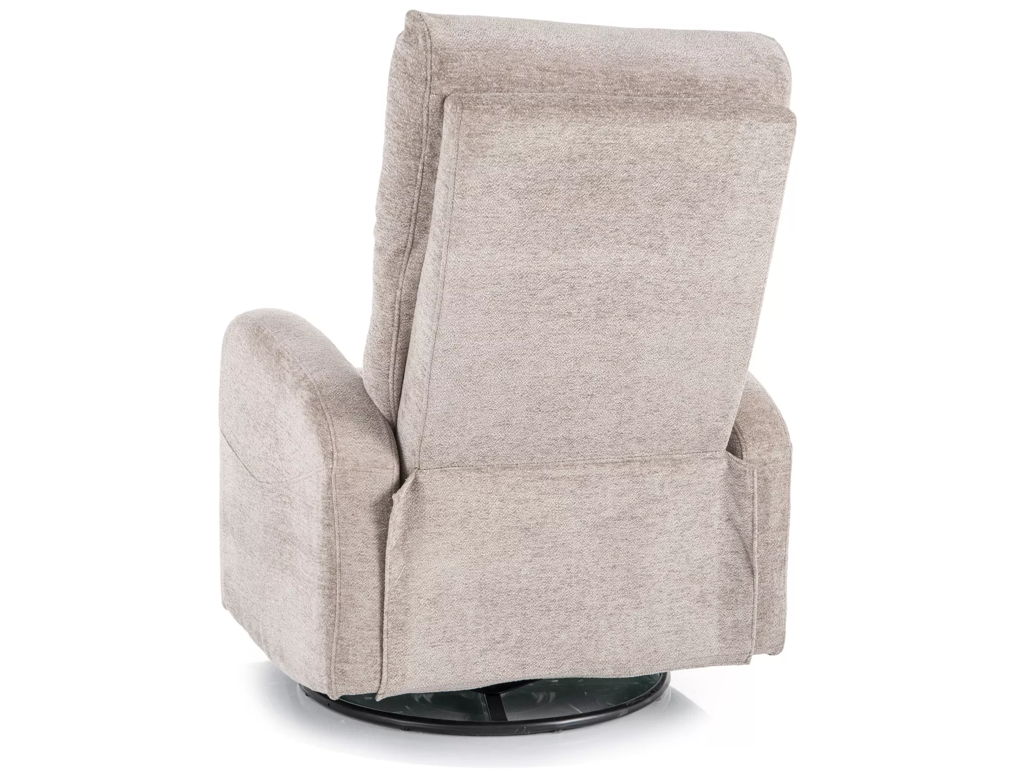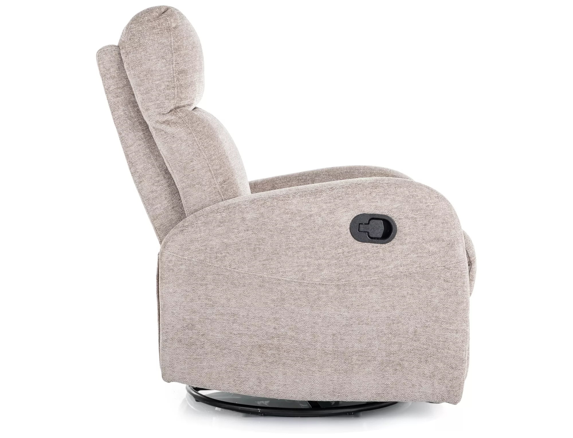 Fotel rozkładany z funkcją kołyski, tkanina Raven 30, stelaż: metal, kolor: ciemny beżowy / czarny. Siedzisko obracane w zakresie 360st., opcja kołyski działa w pozycji złożonej.