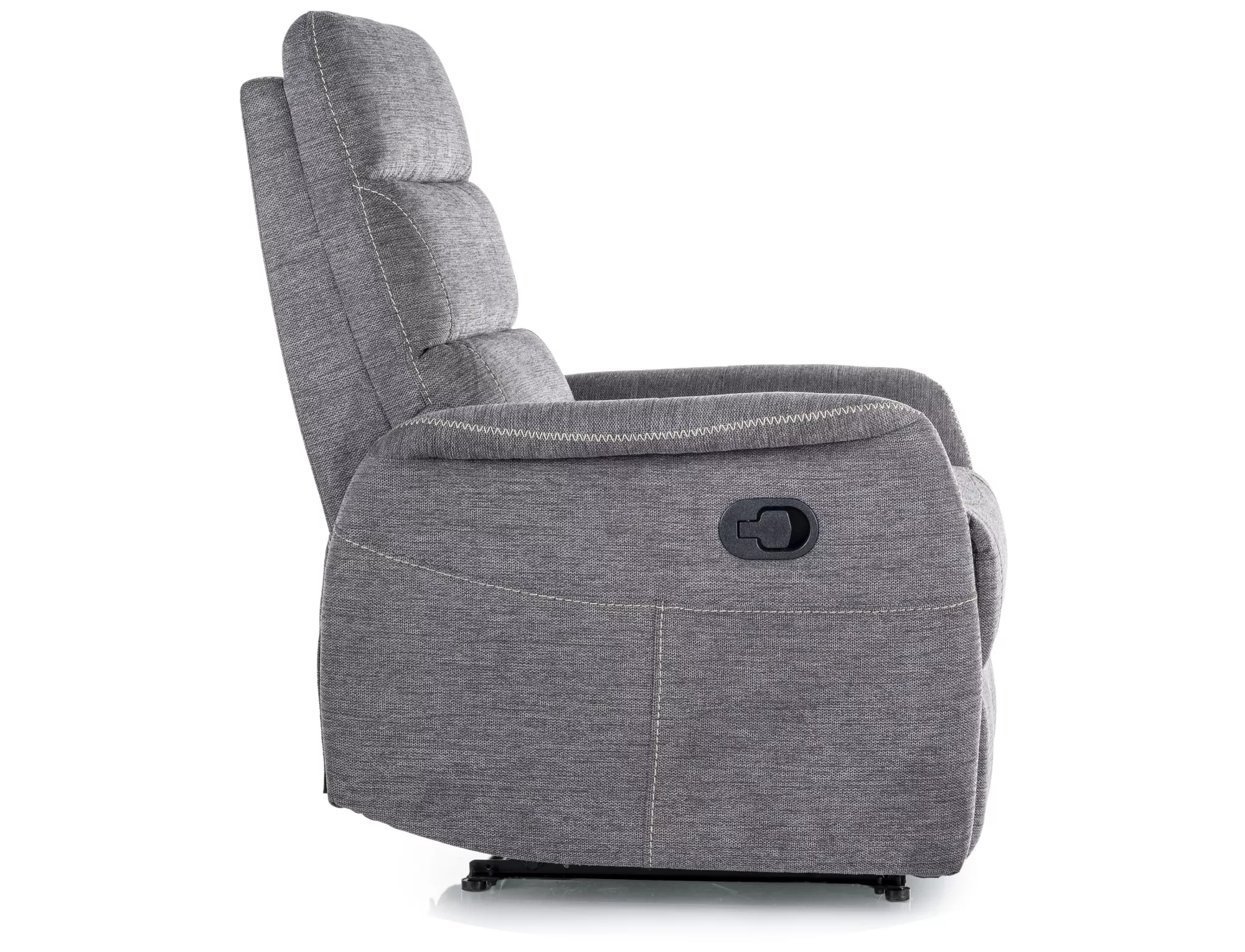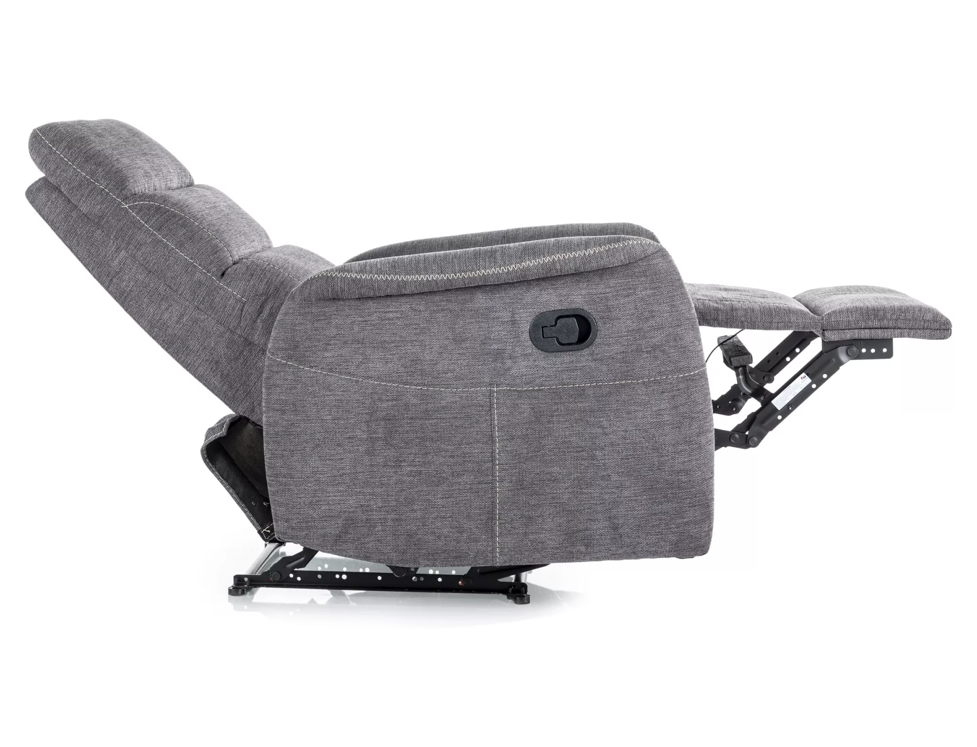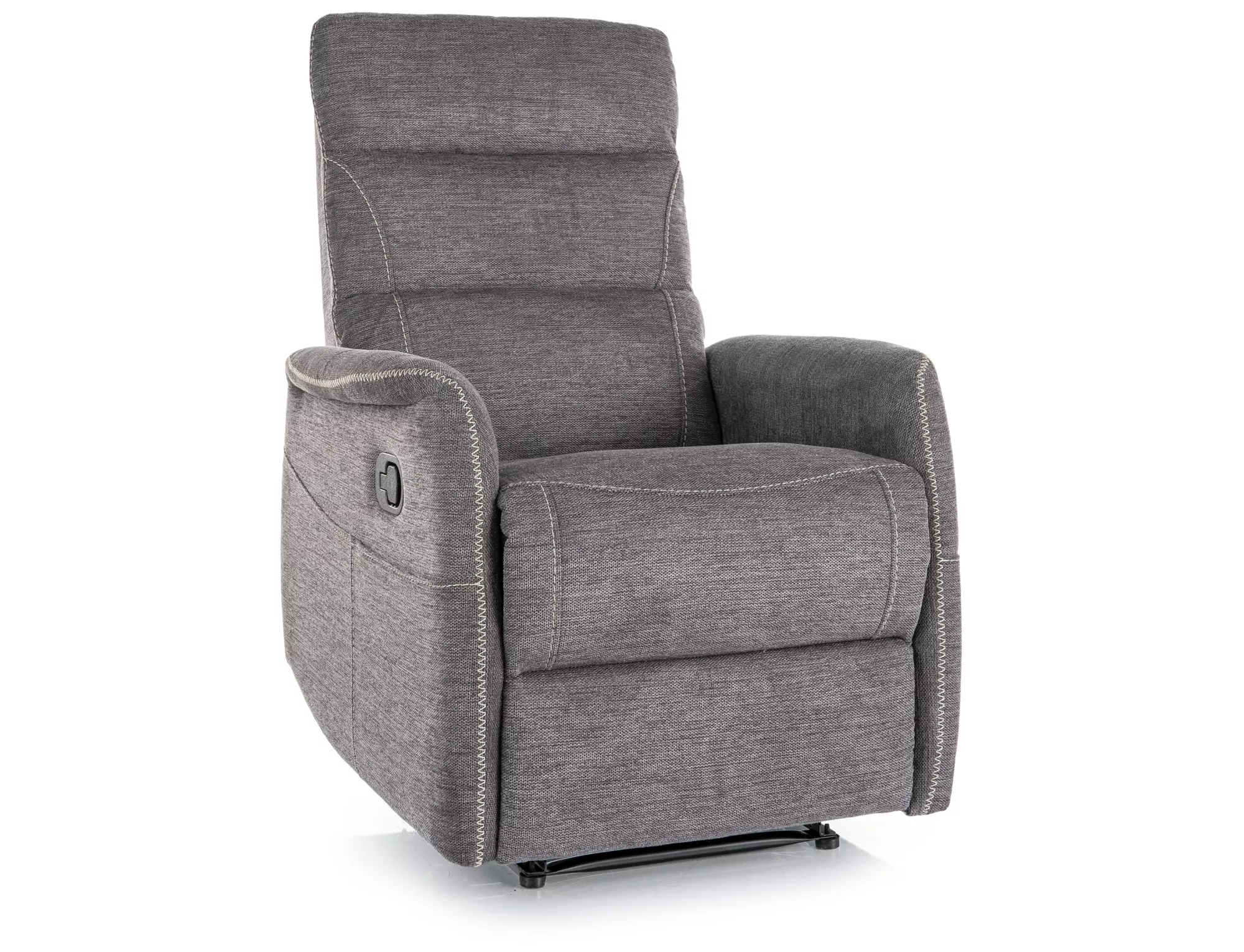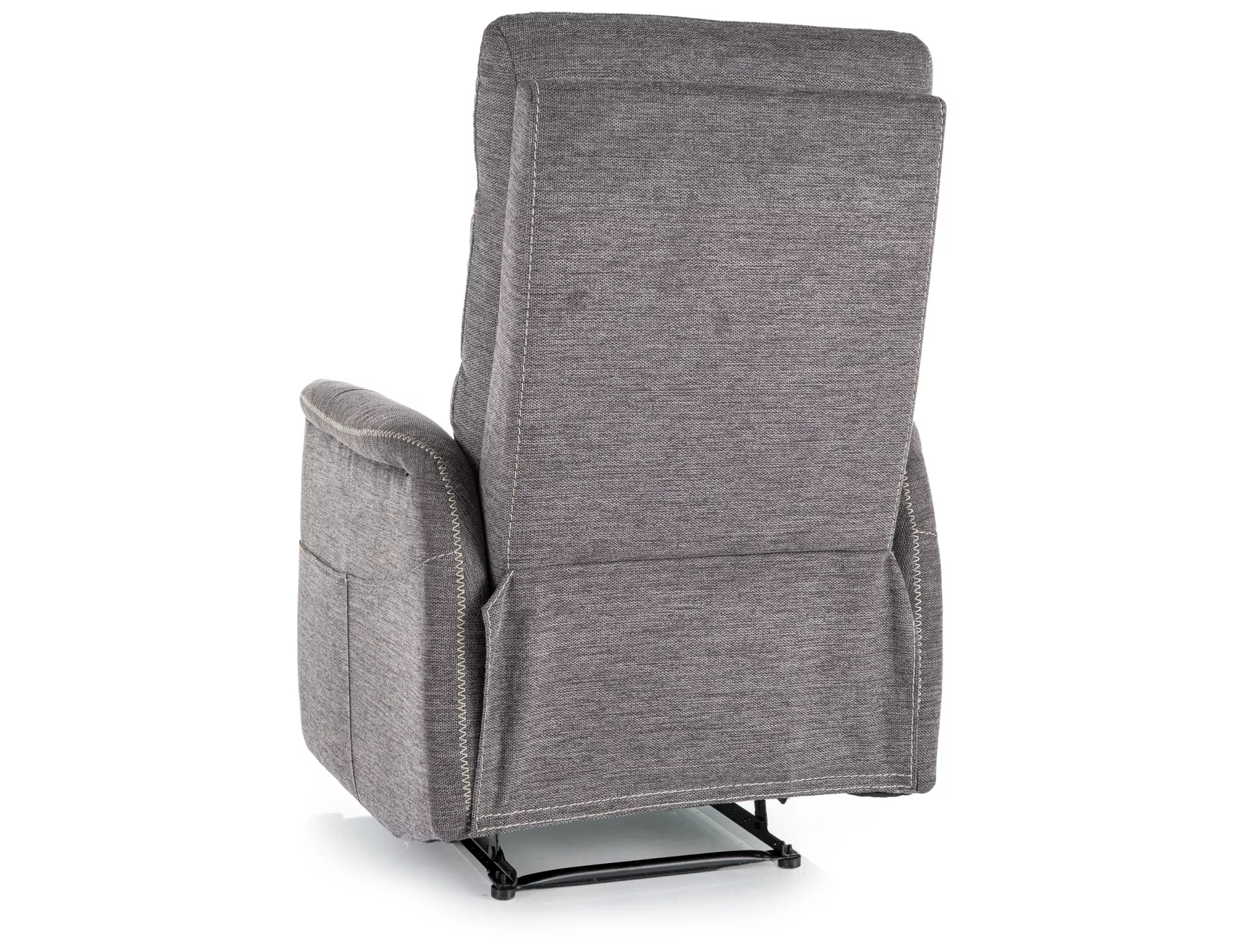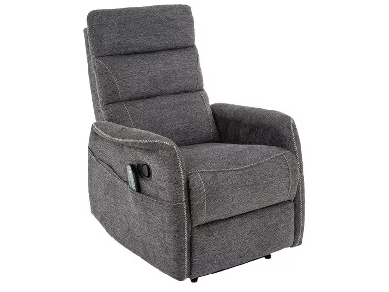 Fotel rozkładany z funkcją masażu, tkanina Brego 18, stelaż: metal, kolor: ciemny szary / czarny. Praktyczna kieszeń na prawym boku, przewodowy pilot sterujący funkcą masażu.