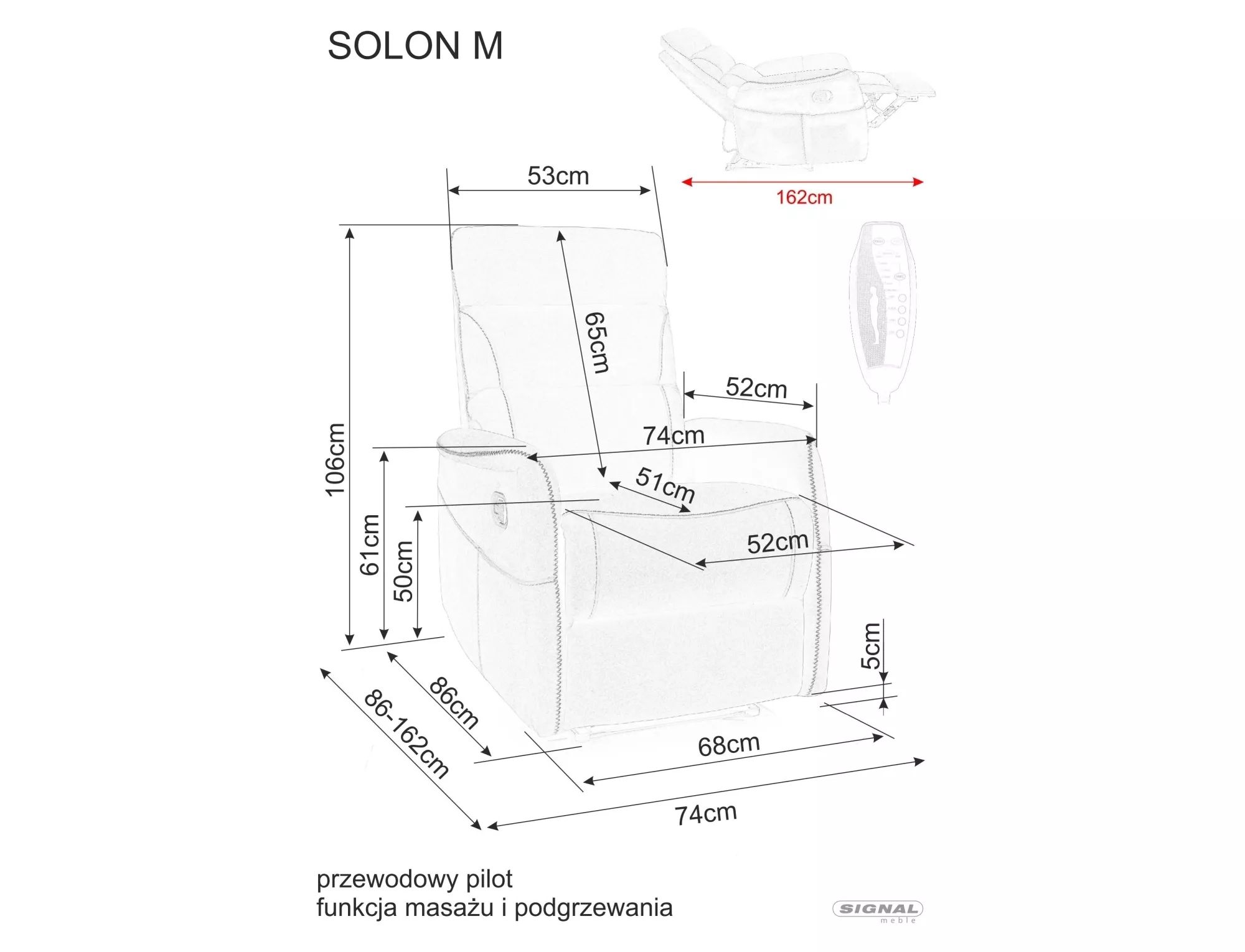 Wymiary fotela: A - 106, B - 74, C - 50, D - 51, E - 86÷162, F - 5 cm