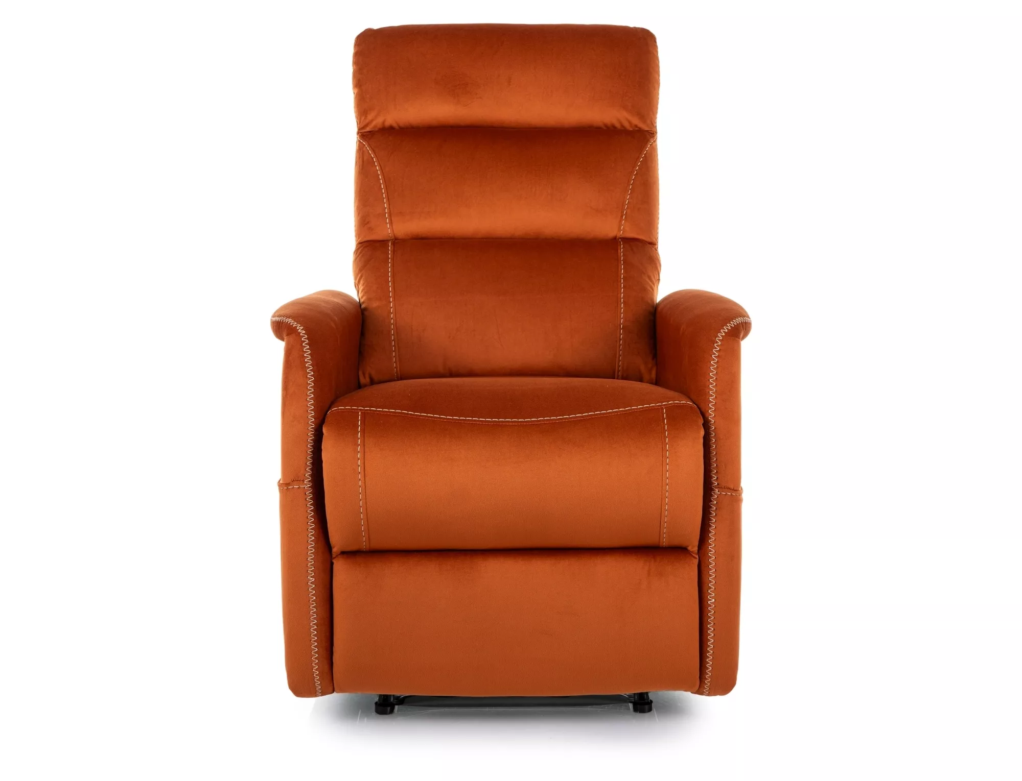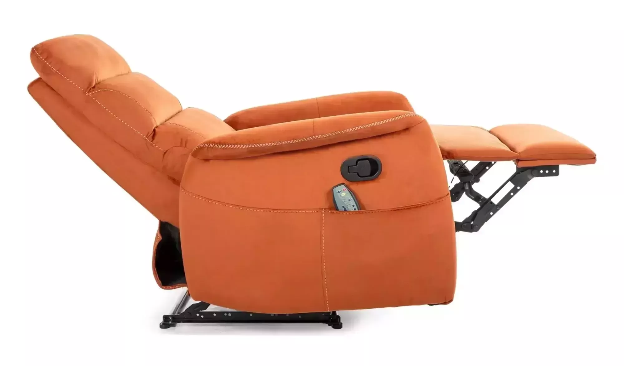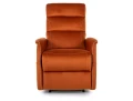 Fotel rozkładany z funkcją masażu, tkanina aksamit: Bluvel 4215, stelaż: metal, kolor: cynamon / czarny. Praktyczna kieszeń na prawym boku, przewodowy pilot sterujący funkcą masażu.