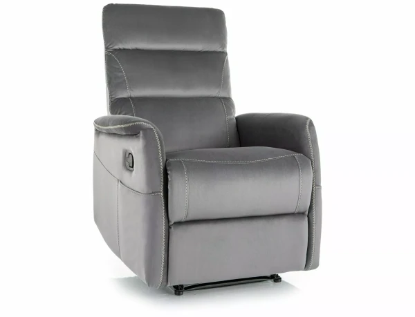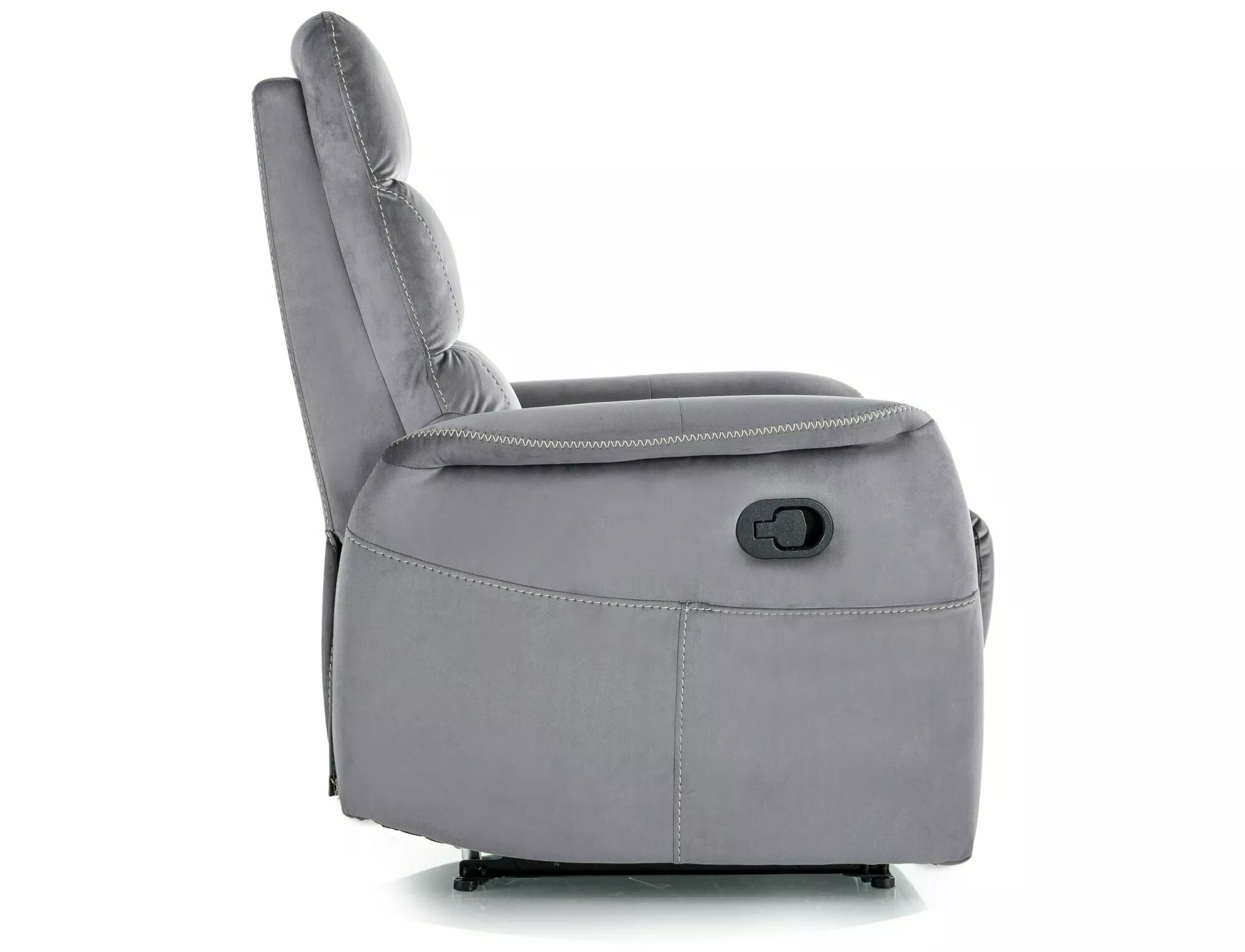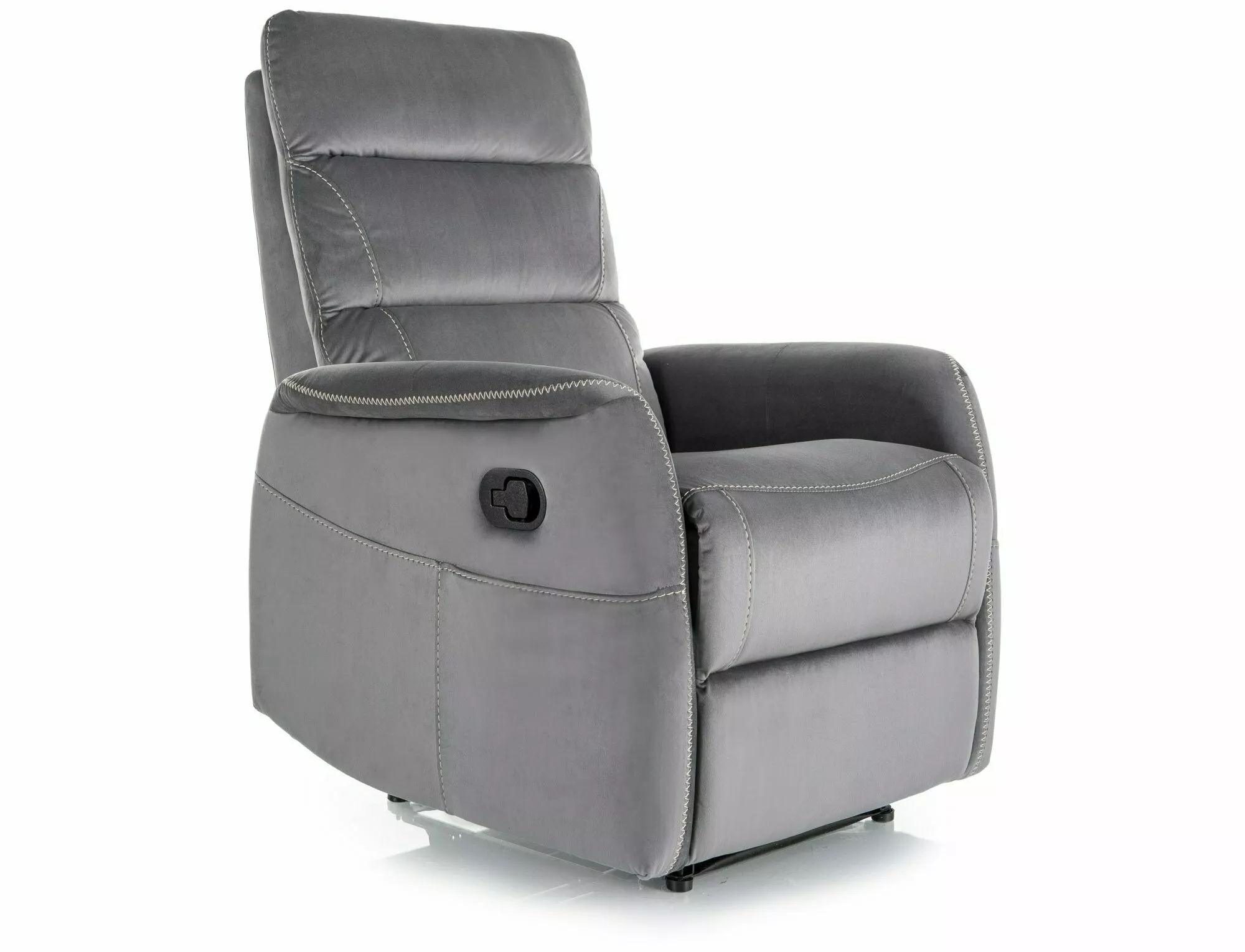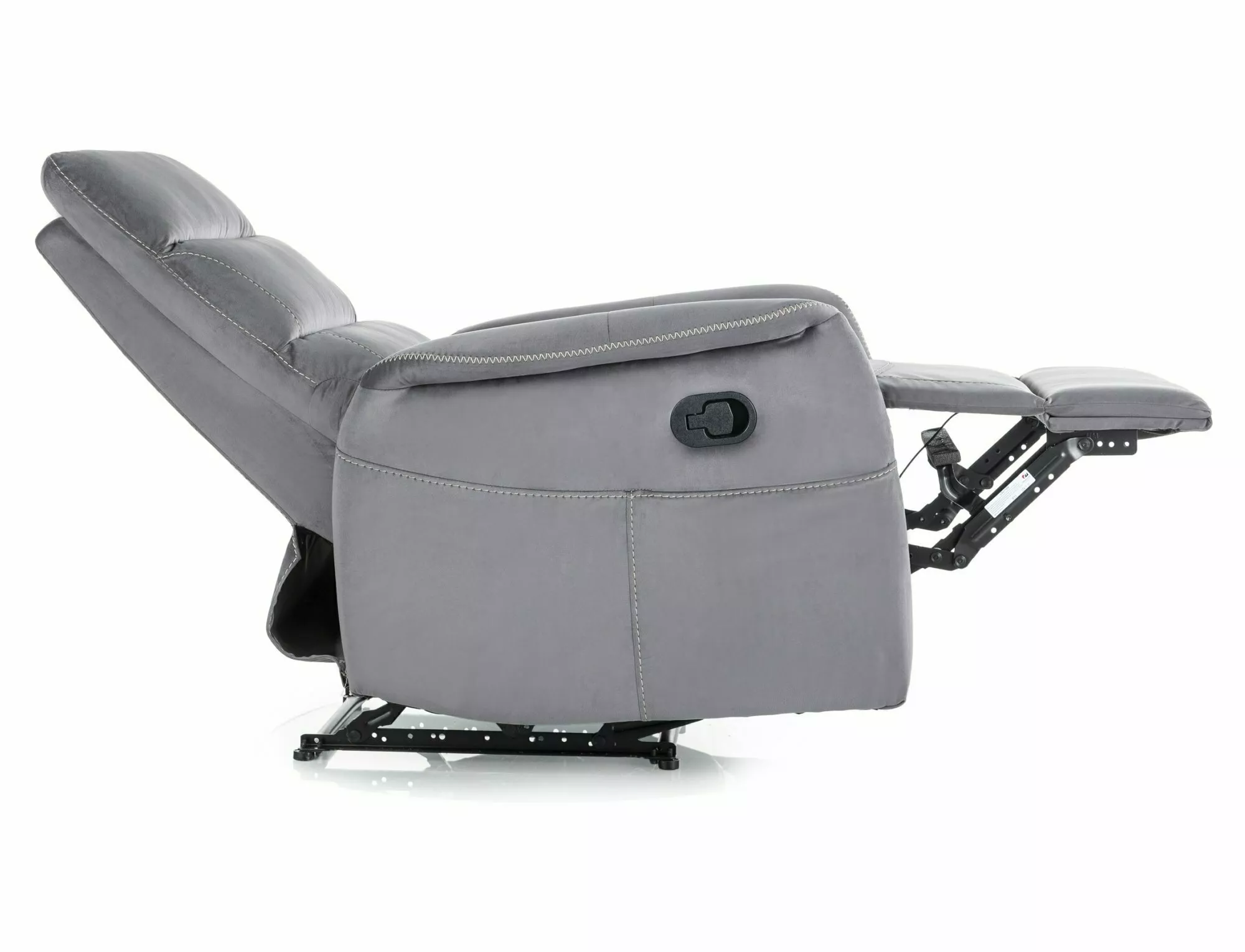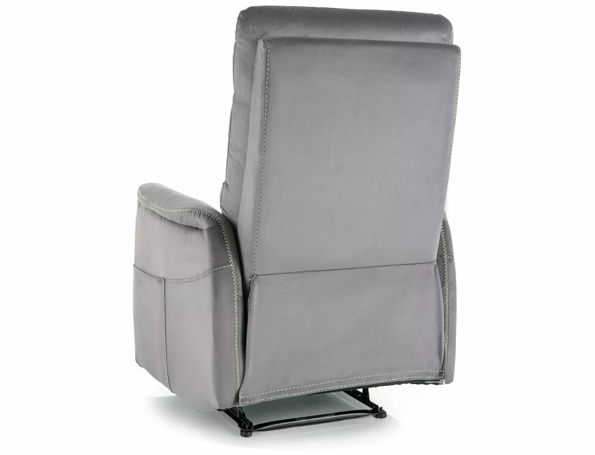Fotel rozkładany z funkcją masażu, tkanina aksamit: Bluvel 14, stelaż: metal, kolor: szary / czarny. Praktyczna kieszeń na prawym boku, przewodowy pilot sterujący funkcą masażu.