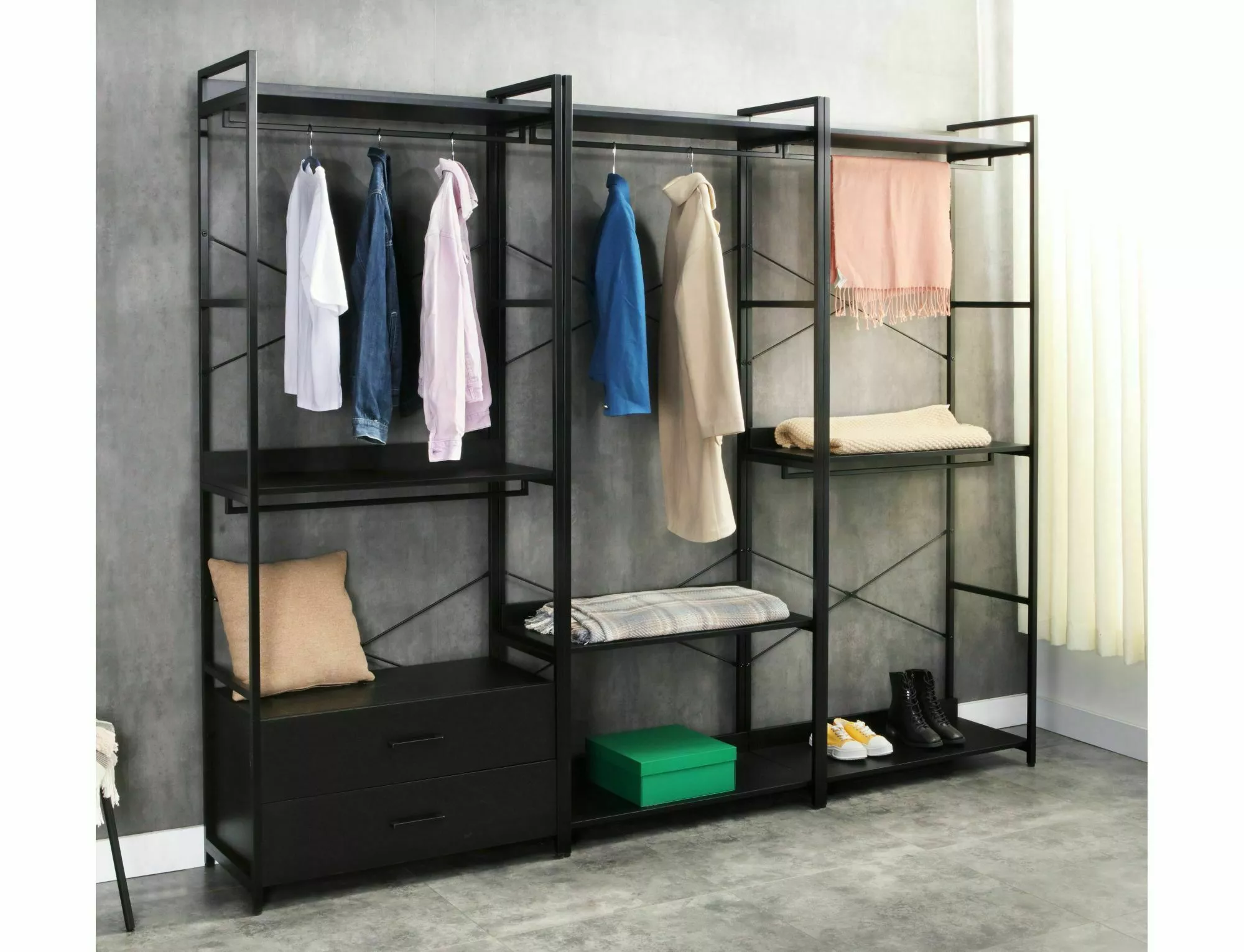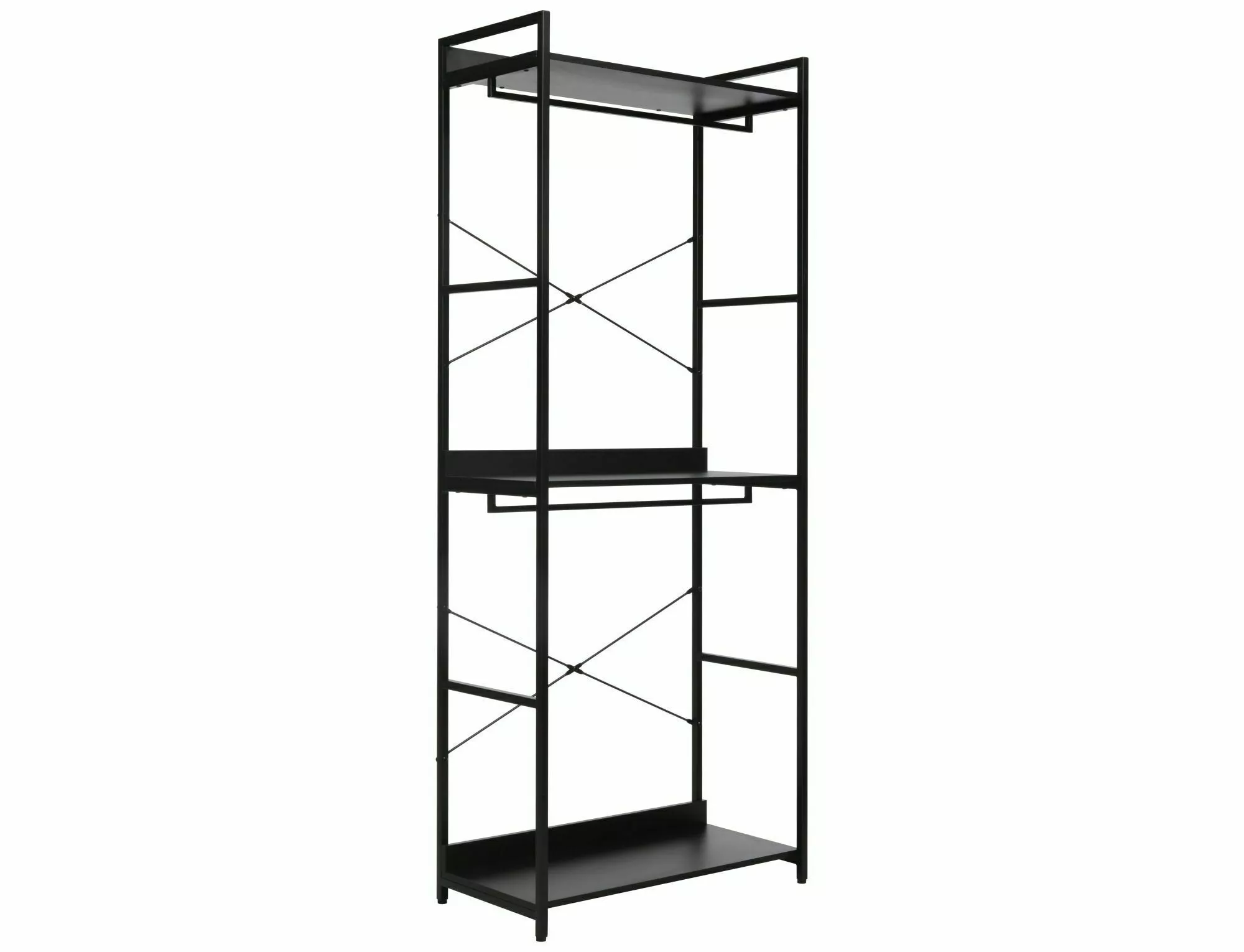 Regał / wieszak, półki: płyta laminowana, stelaż: metal, kolor: czarny / czarny mat.